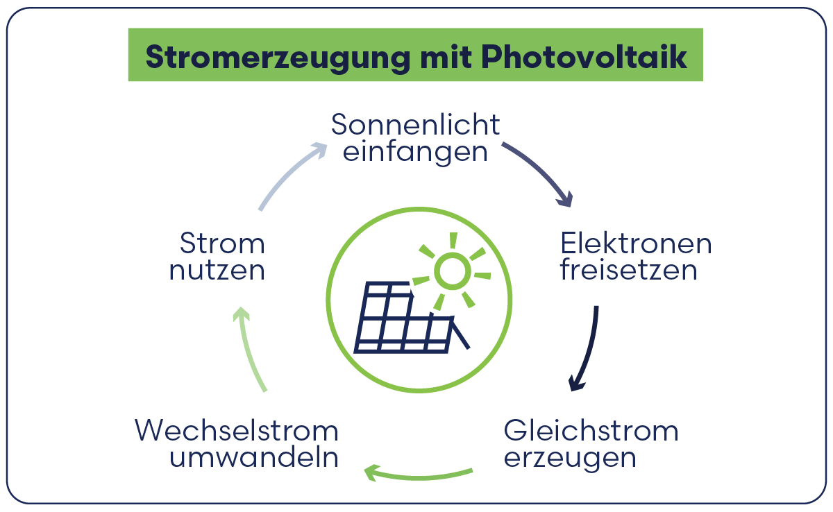 Photovoltaik basiert auf dem photovoltaischen Effekt, bei dem Sonnenlicht direkt in elektrischen Strom umgewandelt wird. Der Prozess läuft folgendermaßen ab: